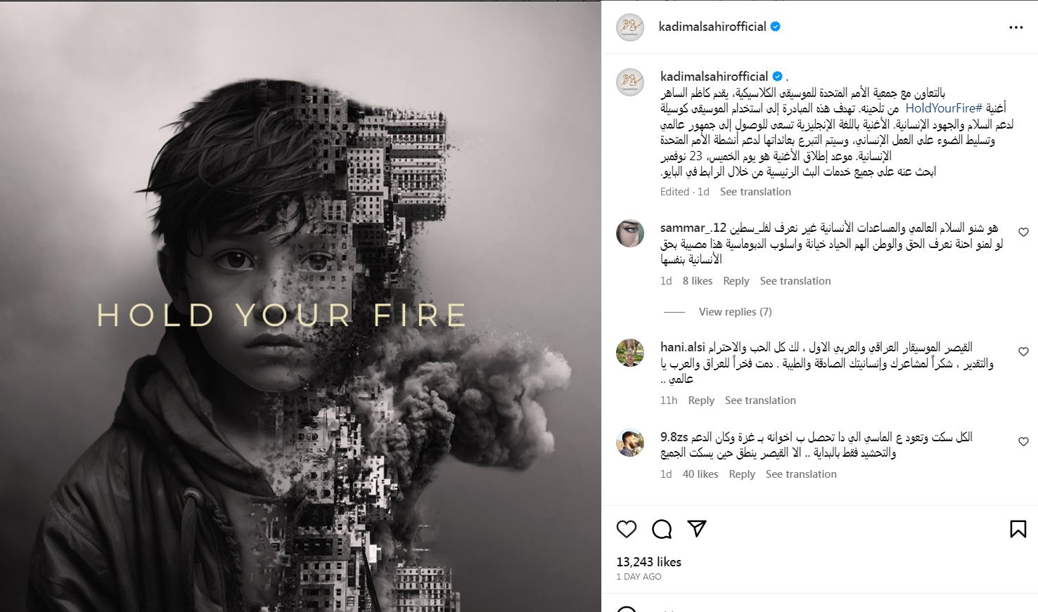 ومن المقرر أن يتم طرح أغنية Hold Your Fire، الليلة، بالتعاون مع جمعية الأمم المتحدة للموسيقى الكلاسيكية، ويقدم كاظم الساهرالأغنية من تلحينه.