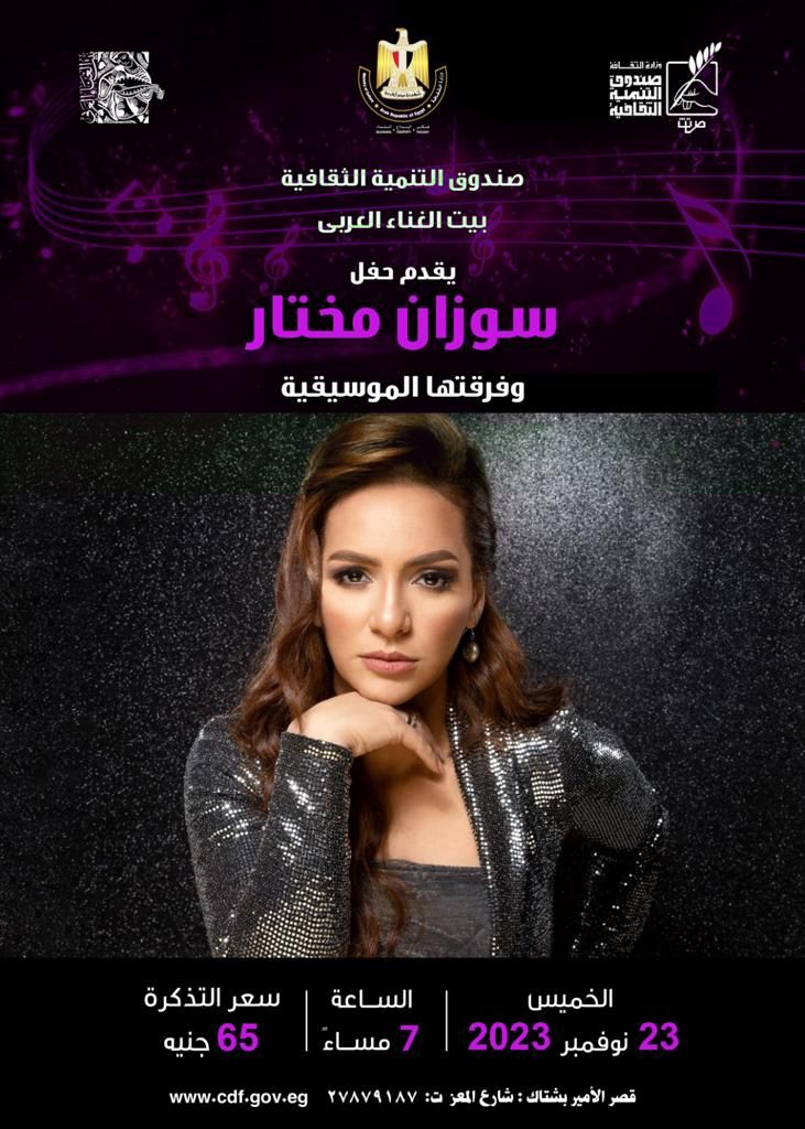 تستعد الفنانة سوزان مختار وفرقتها الموسيقية لإحياء حفلا غنائيا جديدا، وذلك في تمام السابعة من مساء اليوم الخميس، في قصر الأمير بشتاك "بيت الغناء العربي" بشارع المعز.