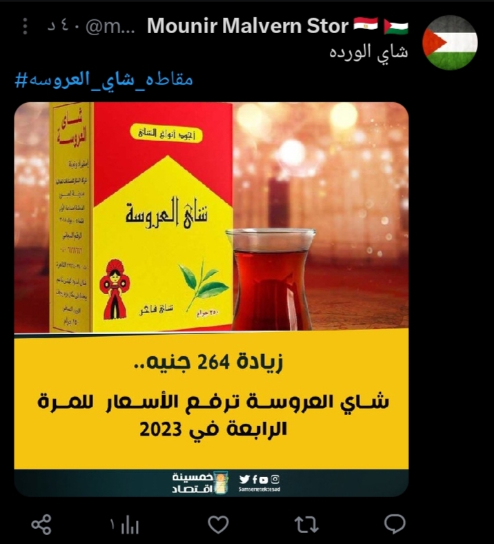 وطالب العديد من رواد مواقع التواصل الاجتماعي على منصتي "إكس وفيسبوك" بمقاطعة منتجات شركة شاي العروسة وطرحوا العديد من البدائل، مثل شاي الكبوس وشاي الوردة وأنواع أخرى، بعد سلوك هذه الشركة برفع سعرها للمرة الرابعة هذا العام وعدم تناسب سعره مع الجودة التي يقدمها وتزامن الزيادة الأخيرة مع حملات دعم المنتج المحلي ومقاطعة العديد من المنتجات الأجنبية.