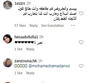 وشن الجمهور هجومًا عنيفًا على محمد رمضان بكتابة التعليقات السلبية فكان أبرزها: “اعلان لبيبسي ده ولا ايه يا فنان .. قاطع البيبسي يسطا .. بيبسي مع المقاطعة وطالع تقول امسك السلاح وحارب انت كده بتحارب في الإتجاه الغلط يا فنان .. ثواني ده بيشرب بيبسي ده انت معندكش دم فعلًا .. الفنان بيعمل دعاية لبيبسي بس بطريقة مبطنة .. قال ابني اللي صور الفيديو عشان وقت ما تهاجموه يرفع حاجبه ويقول مش مقصوده".