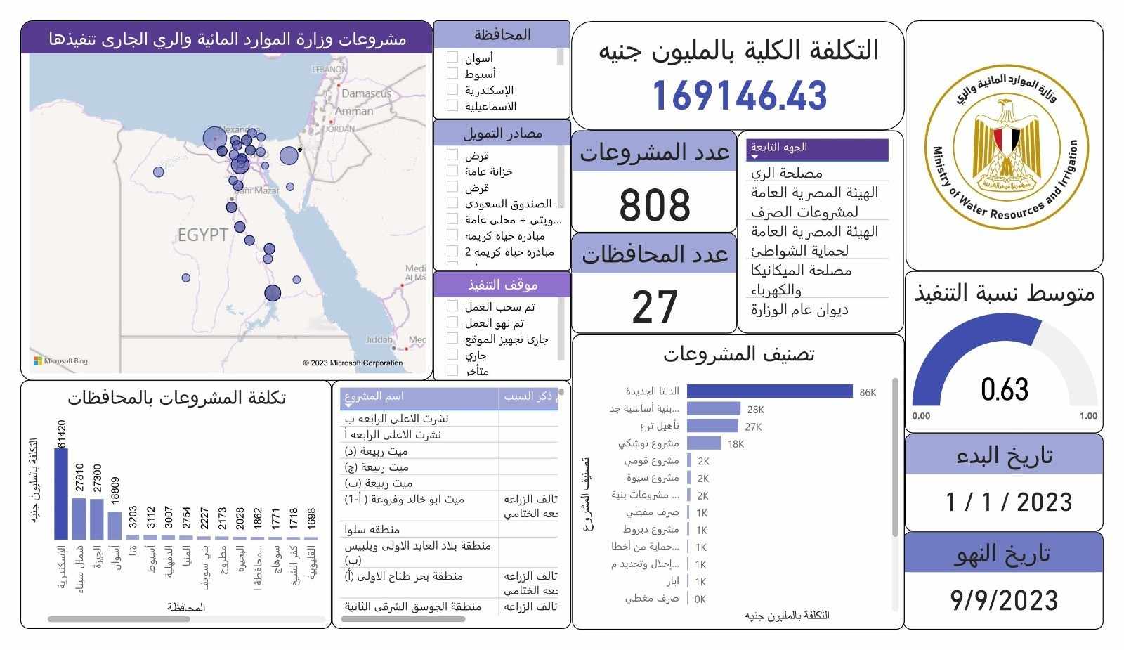 هذا ويتم متابعة معدلات التنفيذ للمشروعات بمختلف أجهزة الوزارة من خلال منظومة عرض تفاعلية تتيح لمتخذى القرار استعراض جميع المؤشرات الخاصة بالمشروعات والمتمثلة في (جهة التنفيذ – مواقع المشروعات – متابعة تواريخ الإنهاء المقررة – موقف التنفيذ - ..... إلخ) ، بالإضافة لتصنيف المشروعات من حيث (جهة التمويل ونوعه – طبيعة المشروعات – العائد والجدوى منها ..... إلخ) ومتوسط نسب التنفيذ والتكلفة بكل محافظة .