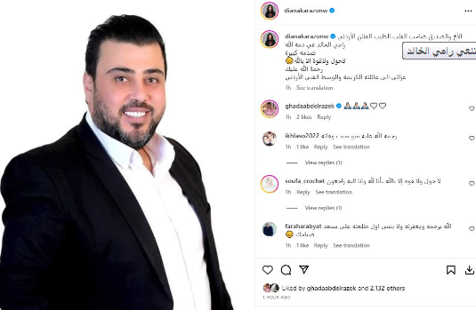 رحل عن عالمنا الفنان الأردني، رامي الخالد، أمس الخميس، إثر تعرضه لأزمة قلبية، ونشرت النجمة دينا كرزون عبر حسابها الرسمي على موقع تبادل الصور والفيديوهات "إنستجرام" وبوست وكتبت فيه، الأخ والصديق صاحب القلب الطيب الفنان الأردني رامي الخالد، في ذمة الله، صدمة كبيرة ، لا حول ولا قوة إلا بالله، رحمة الله عليك، عزائي إلي عائلته الكريمة والوسط الفني الأردني.