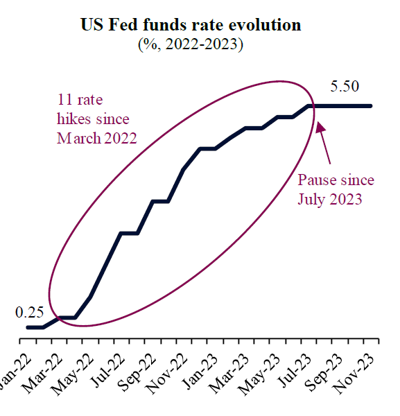 وكان هذان القراران بمثابة "توقف مؤقت" هام في دورة التشديد النقدي التي بدأت في مارس من العام الماضي، بعد أن أدت إحدى عشرة زيادة لأسعار الفائدة إلى وصول سعر الفائدة على الأموال الفيدرالية إلى أعلى مستوياته في أكثر من عشرين عاماً عند مستوى يتراوح بين 5.25% و5.5%.