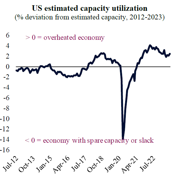 ويشير معدل استخدام الطاقة الإنتاجية في الولايات المتحدة، إذا تم قياسه مع الأخذ في الاعتبار حالة سوق العمل والطاقة الفائضة في القطاع الصناعي، إلى أن قصور الطاقة الإنتاجية لا يزال قائماً.