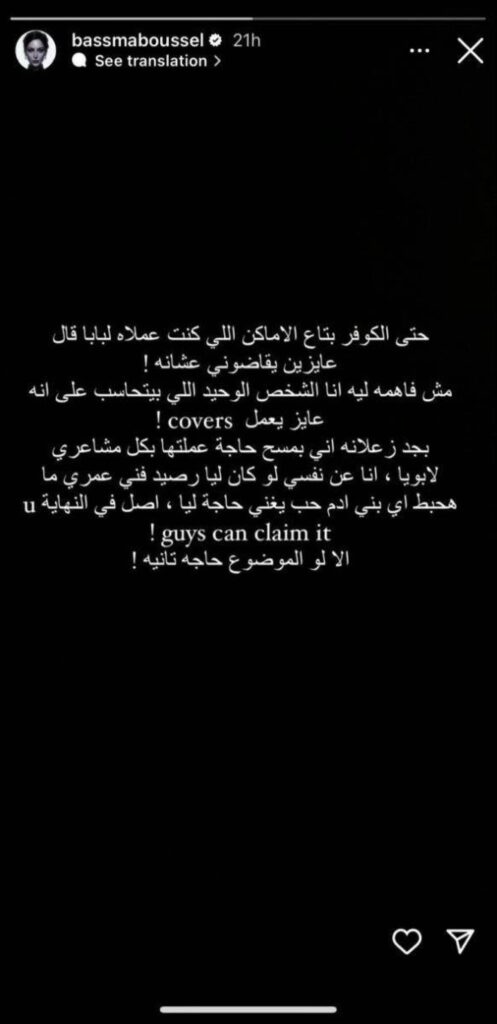 وسرعان ما خرجت بسمة بوسيل عن صمتها، وقالت عبر حسابها على إنستجرام: "حتى كوفر الأماكن التي صنعتها لوالدي قالوا إنهم يريدون مقاضاتي على ذلك، لا أفهم لماذا أنا الوحيدة التي أحاسب على رغبتي في عمل كوفر، أنا زعلانة جدًا إني بمسح حاجة عملتها بكل مشاعري تجاه والدي، أنا شخصيًا، لو كان لي رصيد فني، لما خيبت أمل أي إنسان أحب أن يغني لي شيئًا في النهاية".