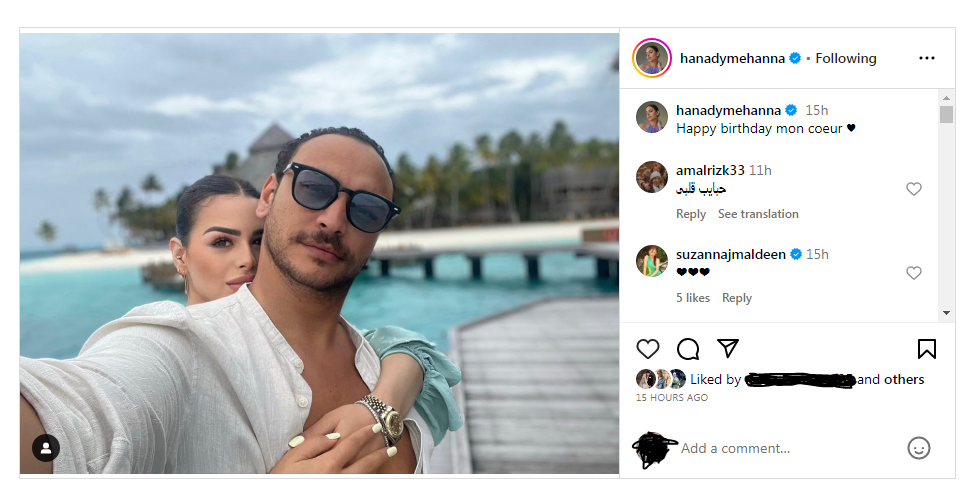 احتفلت الفنانة هنادي مهنا، بعيد ميلاد زوجها الفنان أحمد خالد صالح، لتنشر صورة رومانسية جمعتهما على جزيرة المالديف الساحرة والمميزة بجمالها الطبيعي الخلاب، عبر حسابها الشخصي بموقع تبادل الصور والفيديوهات إنستجرام.