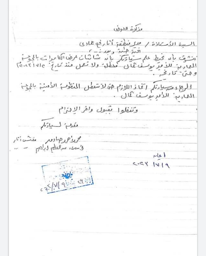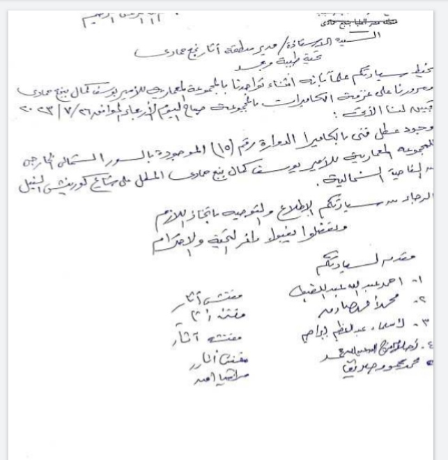 كما حصلت الوفد على مذكرة أخرى موقع عليها من 5 أشخاص من مفتشى الآثار بنجع حمادى، جاء فيها: السيد مدير منطقة اثار نجع حمادي بعد التحية نحيط سيادتكم علما بانه أثناء تواجدنا بالمجموعة المعمارية للامير يوسف كمال بنجع حمادى ومرورنا على غرفة الكاميرات بالمجموعة صباح اليوم الأربعاء الموافق 26 / 7/ 2023 تبين لنا الاتى: وجود عطل بالكاميرا الدوارة رقم (15) الموجوده بالسور الشمالى الخارجى للمجموعة المعمارية للأمير يوسف كمال بنجع حمادى والمطله على شارع كورنيش النيل من الناحية الشمالية.
