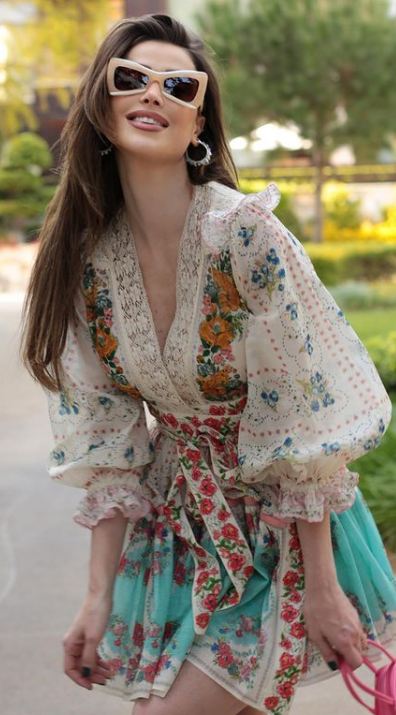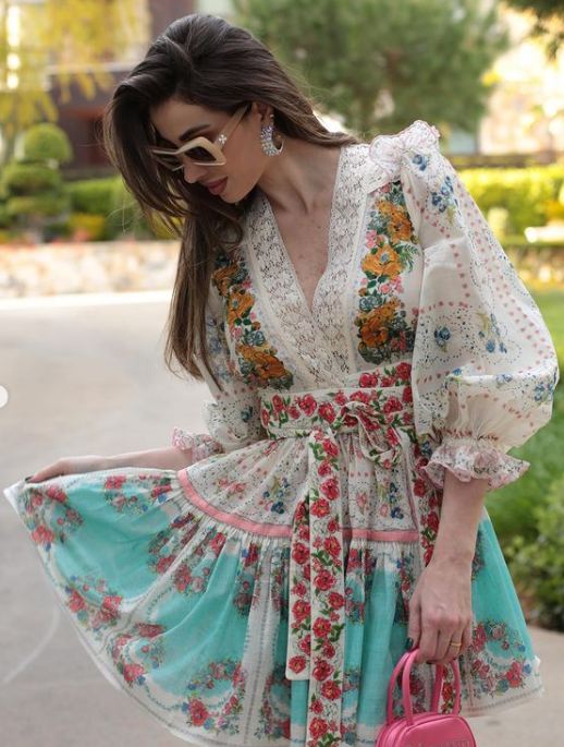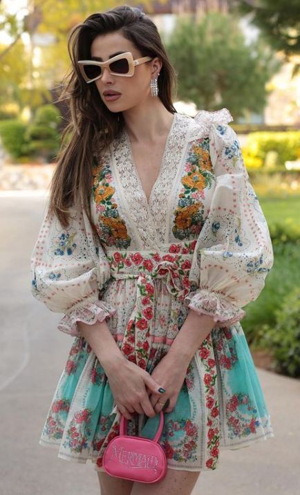 وتألقت إنابيلا هلال بإطلالة صيفية ملونة بزهور الربيع المبهجة، حيث ارتدت فستان قصير مجسم من أعلى وفضفاض من أسفل بأكمام واسعه طويلة، صمم من قماش ناعم الملون منقوش بالورود الصغيرة واغصان الشجر الخضراء مزين بالدانتيل الناعم من الأطراف.