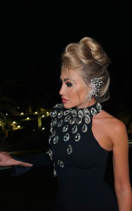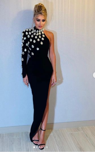 وبدت مايا دياب بإطلالة ساحرة مفعمة بجاذبية اللون الأسود، حيث ارتدت فستانا طويلا مجسما، ينتمي لقصة ألوان شولدر، صمم من قماش المخمل الناعم بلون الأسود والمزين بحبات الكريستال من الأمام، مع فتحتة مثيرة كشفت عن احد ساقيها الفستان عكس رشاقة قوامها ووزنها المثالي، مما جعلها تشبه ذوق النجمة الاستعراضية شريهان.