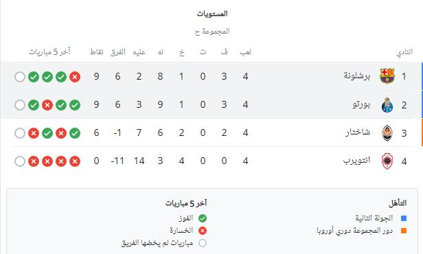 ترتيب مجموعة برشلونة وبورتو