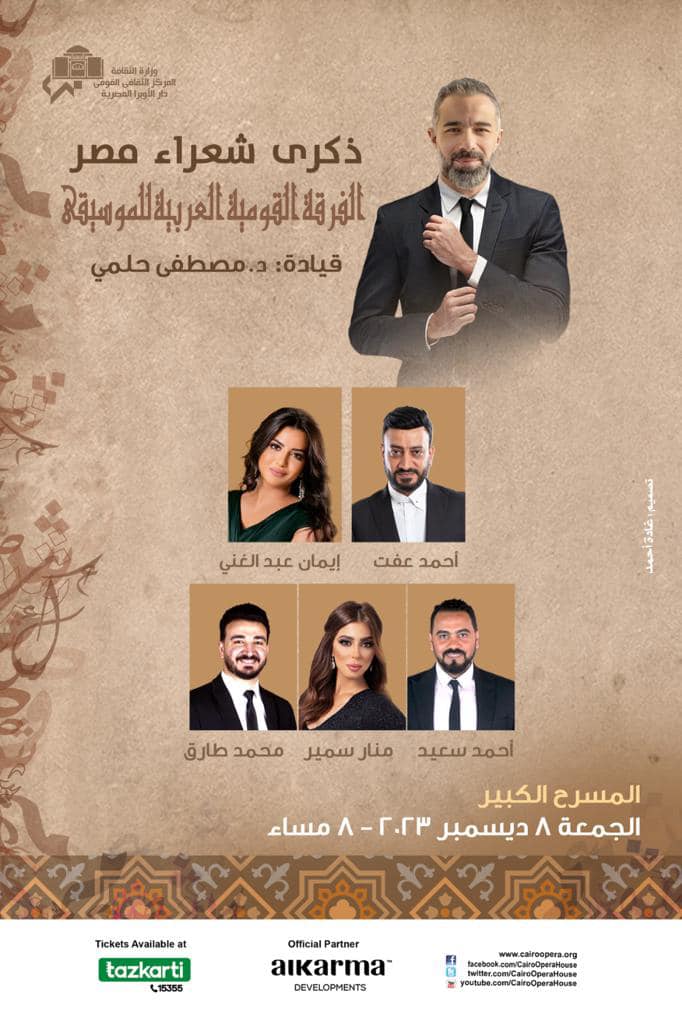 تقدم الفرقة القومية العربية للموسيقى بقيادة د. مصطفى حلمي، حفل غنائي لإحياء ذكرى شعراء مصر، ضمن موسم الحفلات الشتوية على عدد من مسارح الأوبرا المصرية.