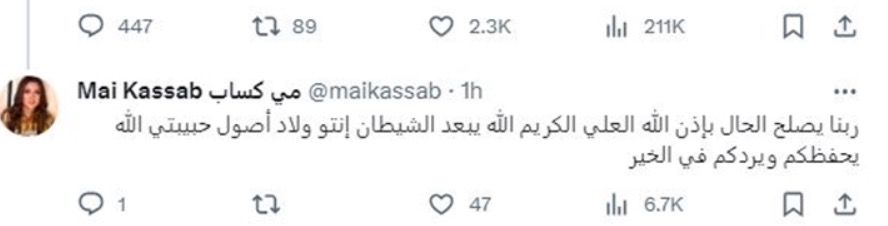 وحاز المنشور الذي نشرته إنجي على صفحتتها الرسمية على موقع التدوينات المصغرة اكس على تفاعل كبير من المتابعين وأصدقائهما من الوسط الفني ومن ضمنهم الفنانة مي كساب حيث وجهت رسالة متمنية من خلالها أن تعود الحياة لمجاريها بينهما. قائلة:" ربنا يصلح الحال بإذن الله العلي الكريم الله يبعد الشيطان إنتو ولاد أصول حبيبتي الله يحفظكم ويردكم في الخير".
