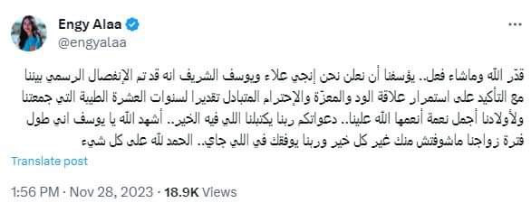 وكانت قد كتبت إنجي: "قدّر الله وماشاء فعل.. يؤسفنا أن نعلن نحن إنجي علاء ويوسف الشريف أنه قد تم الإنفصال الرسمي بيننا مع التأكيد على استمرار علاقة الود والمعزّة والإحترام المتبادل تقديرا لسنوات العشرة الطيبة التي جمعتنا ولأولادنا أجمل نعمة أنعمها الله علينا".