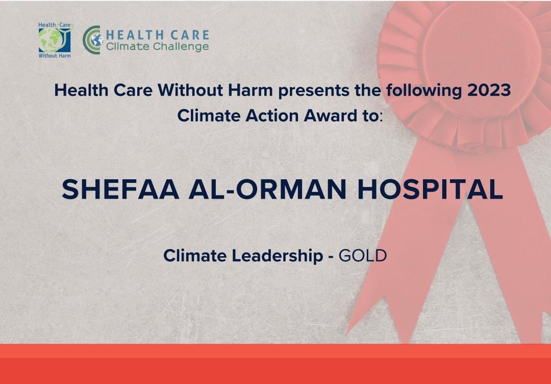 وتم اختيار مستشفى شفاء الاورمان، ومنحها الشهادة الذهبية في التميز في القيادة المناخية لعام 2023 ضمن أفضل 13 منشأة صحية تم اختيارها على مستوى العالم وذلك ضمن مبادرة تحدي مناخ الرعاية الصحية، والتي تضم أكثر من 300 مؤسسة مشاركة تمثل أكثر من 22000 مستشفى في 40 دولة تلتزم بالعمل المناخي الفعال الذي يركز على المرونة وإزالة الكربون والقيادة.