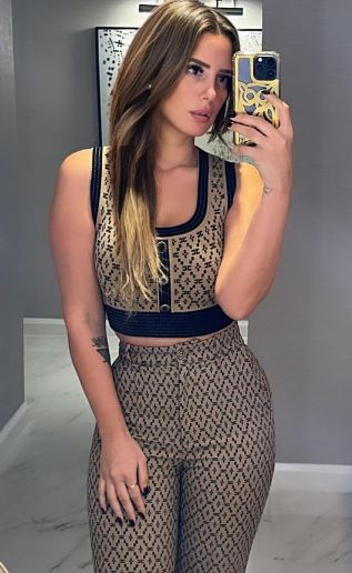 وبدت بإطلالة عصرية لافتة، حيث ارتدت بادي توب قصير كشف عن خصرها وبنصف كم وعليه بنطال ينتمي لقصة الهاي ويست، صمم من قماش ناعم بنقشة جذابة جمع بين اللونين الأسود والبيج.