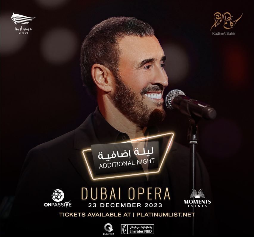 ونظرًا للإقبال الجماهيري الكبير على حفل كاظم الساهر الأول في أوبرا دبي بتاريخ 22 ديسمبر، تقام ليلة إضافية في 23 ديسمبر
