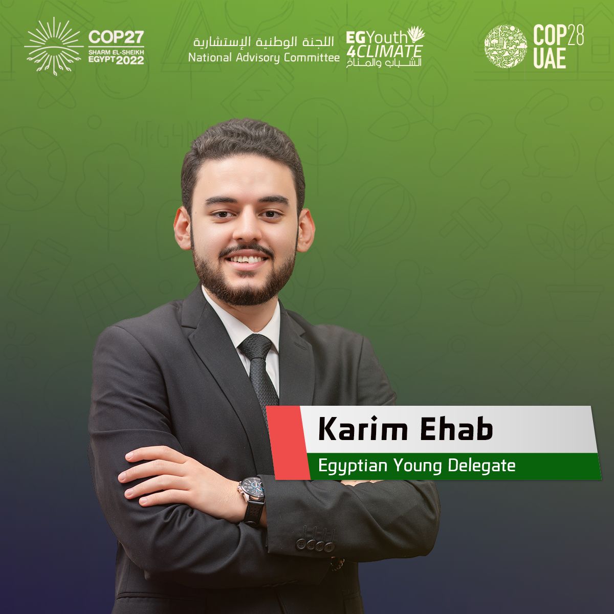 4- كريم إيهاب، مهندس طيران و فضاء وزميل في السباق إلى الصفر في فريق أبطال المناخ. وهو أيضًا عضو في فريق عمل الشباب ل COP27. تم اختيار كريم كقائد للاستدامة من قبل Y4S Masdar، وتتنوع خبرته المؤثرة من خطابات COP27 الرئيسية إلى العمل المجتمعي من أجل التغيير الإيجابي.