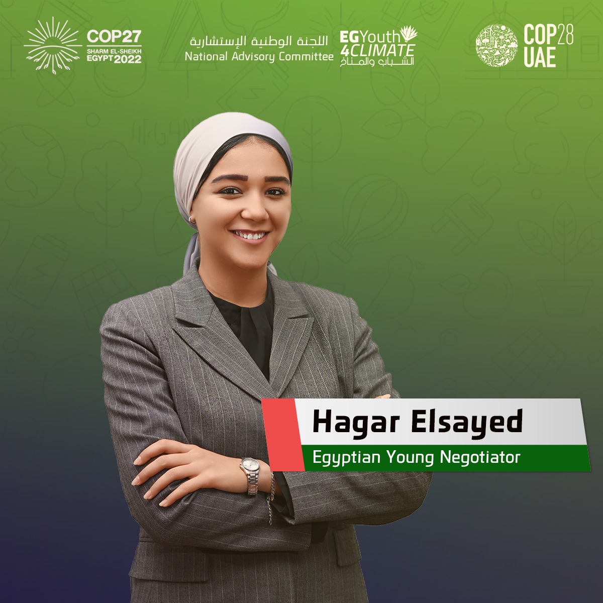6- هاجرالسيد، باحثة اقتصادية في مركز المعلومات ودعم اتخاذ القرار بمجلس الوزراء، وتركز بشكل خاص على القضايا التقاطعية مع تغير المناخ، كانت عضوًا بالمجموعة الشبابية المعنية بتحضيرات قمة المناخ، وتم اختيارها في برنامج سفراء المناخ "ماكس ثابيسو إدكنز" تحت رعاية البنك الدولي، ساهمت ببحث بعنوان "تأثير تغير المناخ على حركة الهجرة الدولية" والذي حصل على الجائزة الثانية في مسابقة منظمة الهجرة الدولية للأبحاث المتخصصة بموضوعات الهجرة.