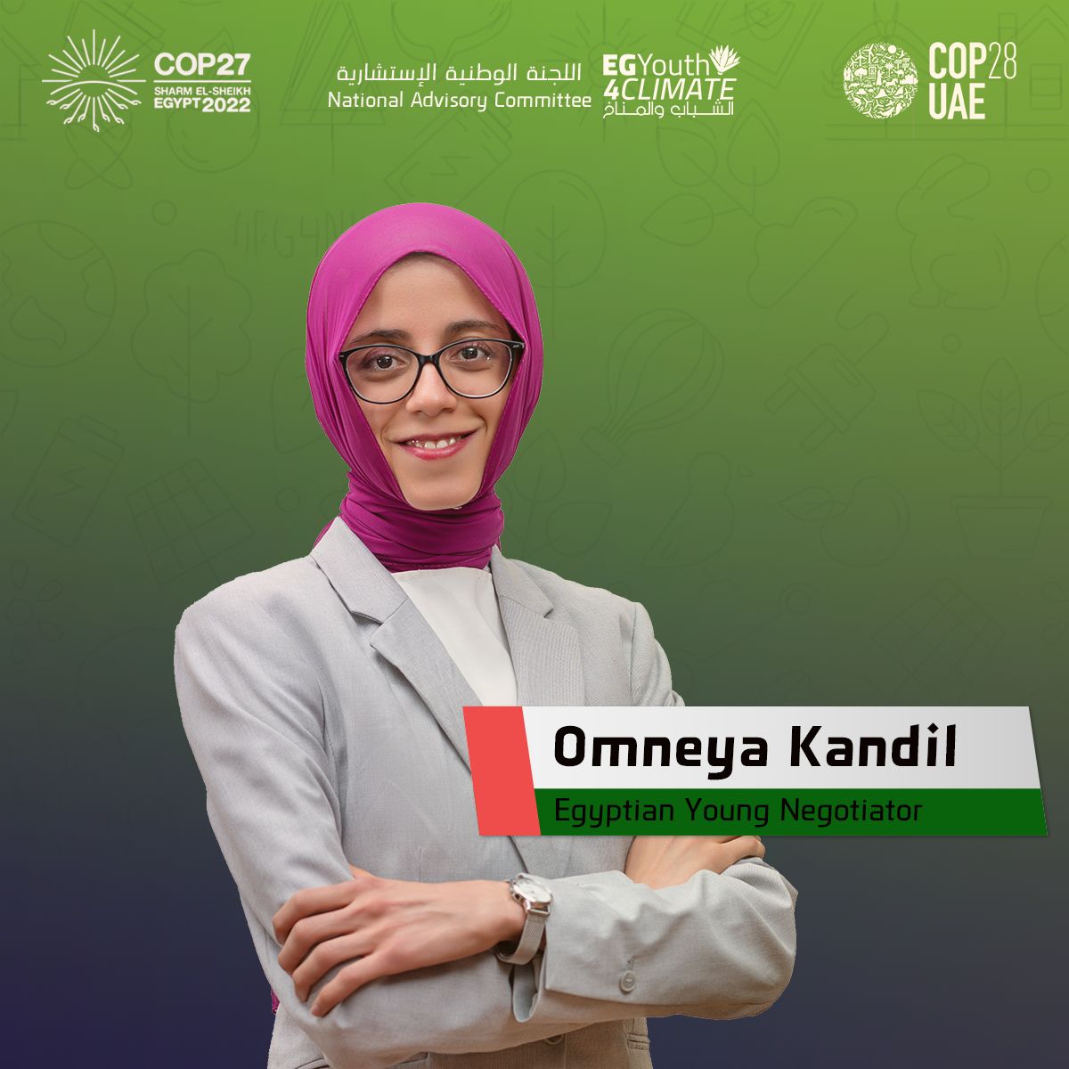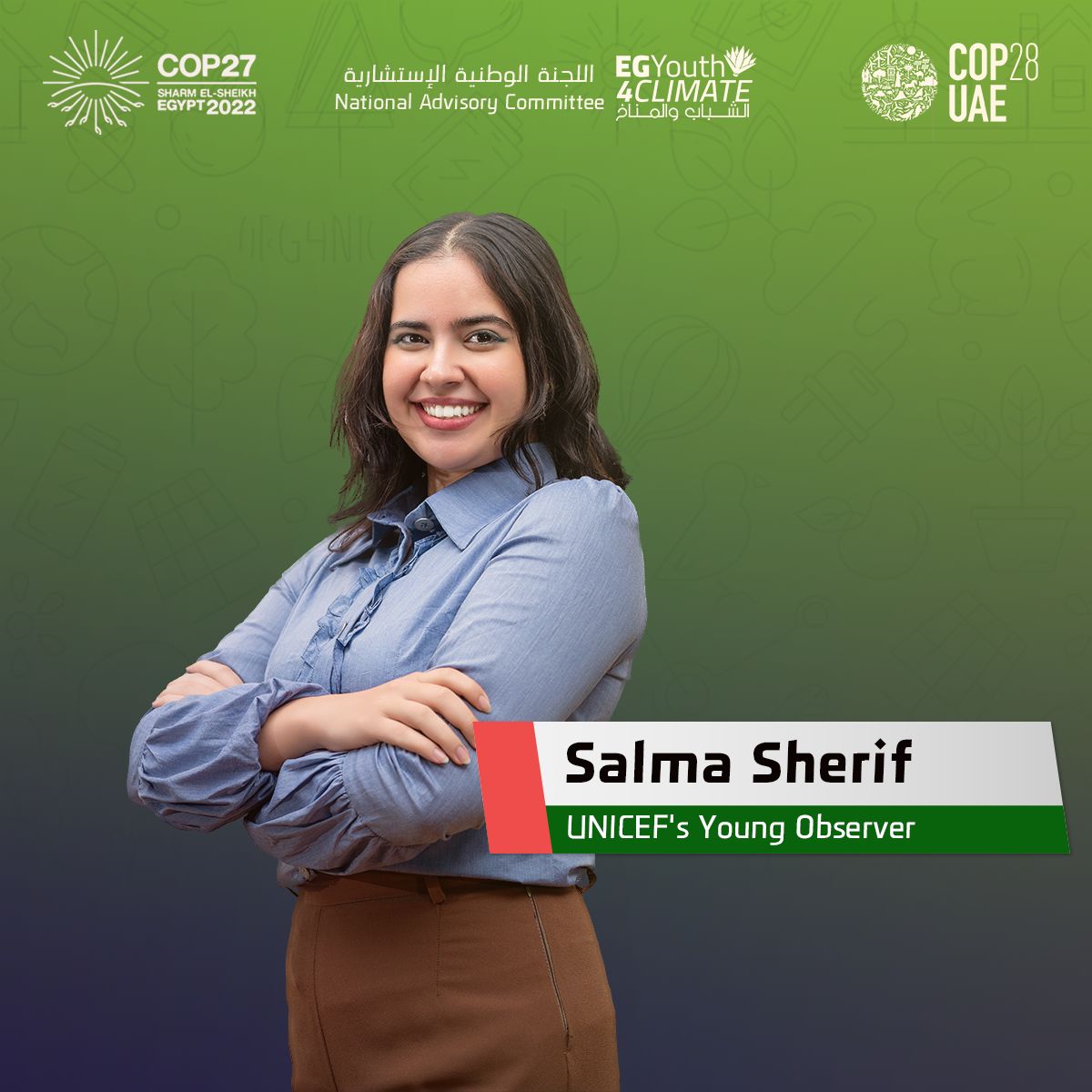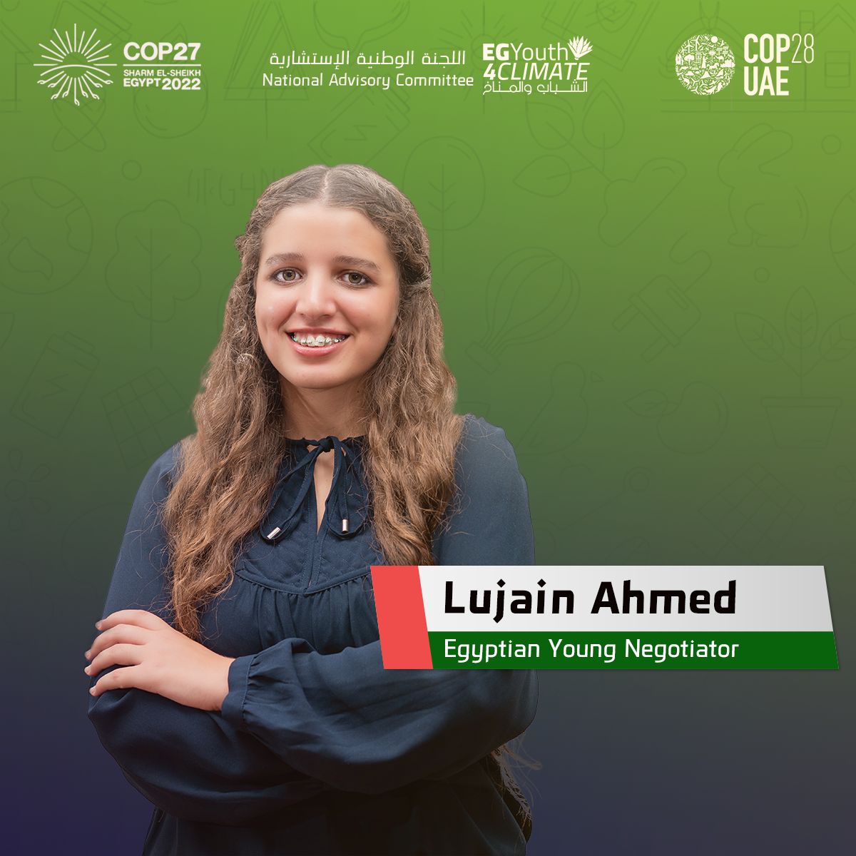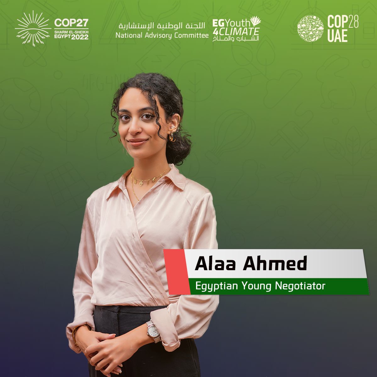 1- الاء عبد الجواد، طالبة بالفرقة الخامسة بكلية الصيدلة جامعة نيوجيزة و هي ايضاً سفيرة الشباب لمنطقة الشرق الاوسط و شمال افريقيا لبرنامج Connecting Climate Minds. كانت الاء عضوا في مجموعة العمل الرسمية للشباب بقمة المناخ السابعة و العشرون، و مبعوثة للتنمية الخضراء في المنتدى الشبابي المصري الروسي الثالث.