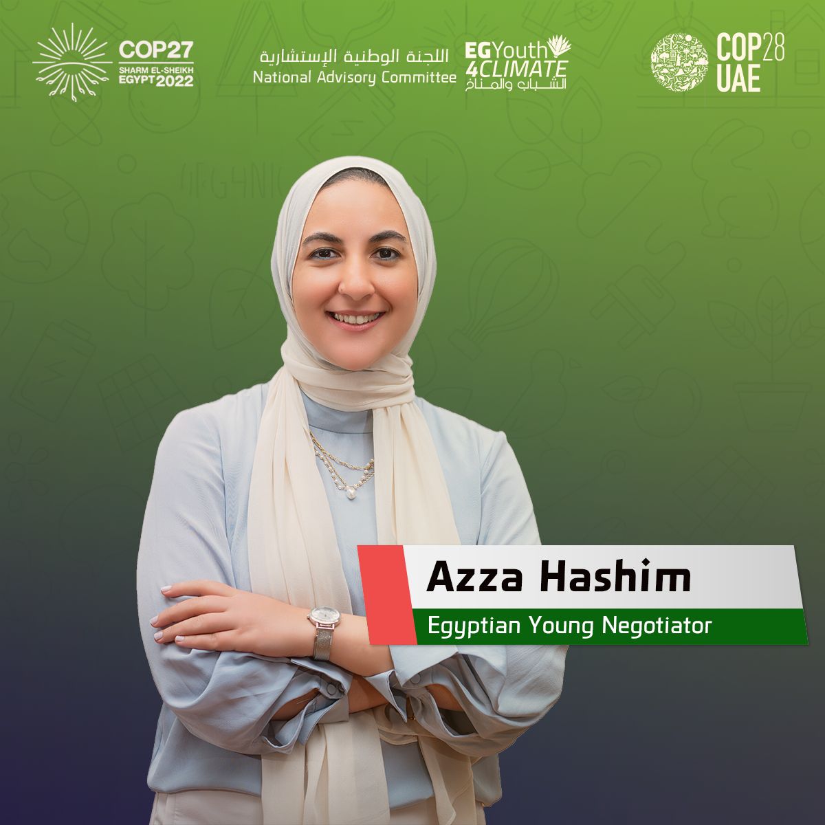9- عزه هاشم، صيدلانية، داعية لأهداف التنمية المستدامة على المستوى الإقليمي، ومدرب معتمد Agile coach. تتمتع عزه بخبرة تزيد عن 10 سنوات في التطوير المؤسسي، إدارة المشروعات المرنة والتخطيط الاستراتيجي، وسفيرة للعمل في قضية تغير المناخ، لعبت دوراً نشطاً في COP27 بصفتها مديرة مشروعات ، تقود العديد من المبادرات والبرامج للمساهمة في رؤية مصر 2030 و NCCS 2050 ، مع التركيز على بناء القدرات ، وتمكين الشباب ، والسياسات ، وتوعية القطاعين العام والخاص لتشجيع المسؤولية المجتمعية والدعوة للتنمية المستدامة.