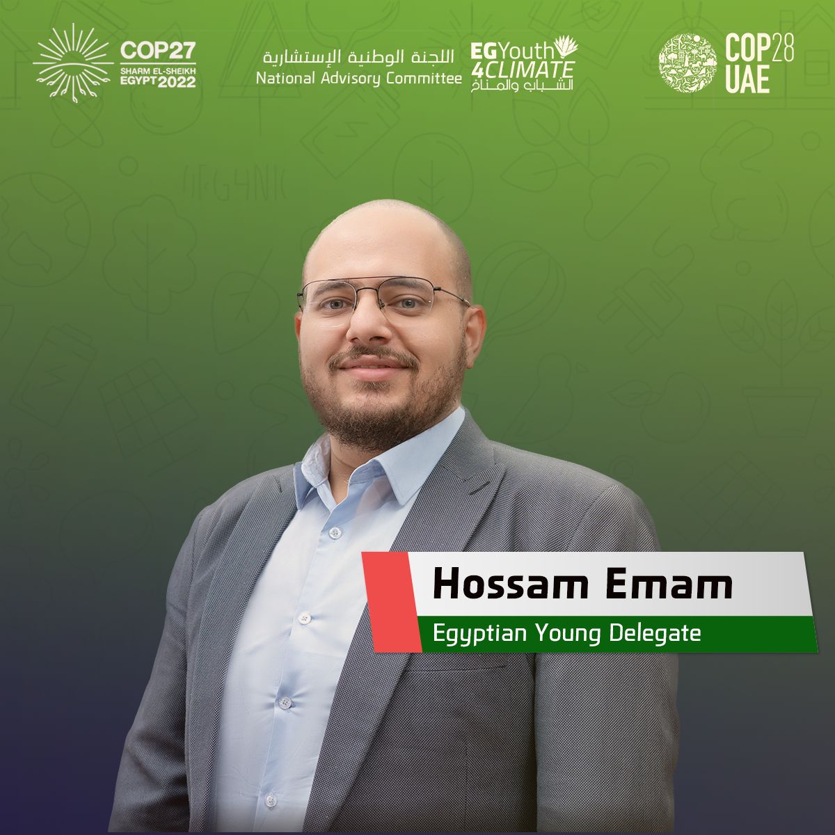 3- حسام امام، مهندس مدني من مصر، رائد اعمال مجتمعي، مؤسس شريك و المدير التنفيذي لشركة أكتس للتنمية المستدامة ، ناشط مناخي و مؤسس شريك لمؤتمر التغيرات المناخية المحلي للشباب، عضو بالفريق التنسيقي العالمي الخاص بيونجو الدائرة الرسمية للشباب والأطفال في الاتفاقية الاطارية الخاصة بالامم المتحدة و المعنية بالتغير المناخي، و سفير ببرنامج الاتحاد الأوروبي جيل الخاص ببرنامج الدول المجاورة للاتحاد الأوروبي.