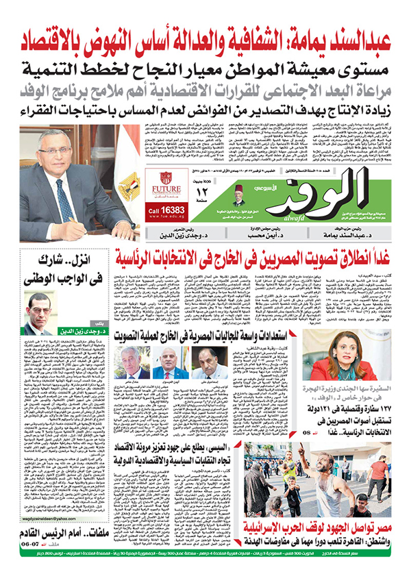 تنشر جريدة الوفد اليومية الورقية في عددها الصادر، غدًا الخميس، العديد من الموضوعات والتقارير الإخبارية المهمة، أبرزها: "عبد السند يمامة: العدالة أساس النهوض بالاقتصاد".