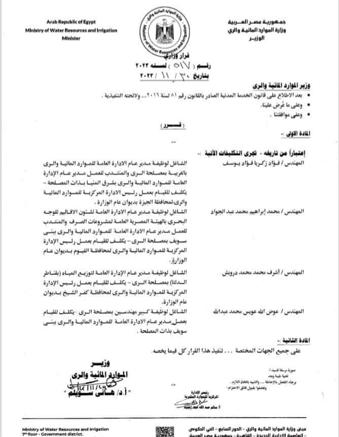 وجاء نص القرار بتكليف المهندس محمد إبراهيم عبدالجواد الشاغل لوظيفة مدير عام الإدارة العامة لشئون الأقاليم للوجه البحري بالهيئة المصرية العامة لمشروعات الصرف والمنتدب للعمل مدير عام الإدارة العامة للموارد المائية والري بمحافظة بني سويف بمصلحة الري، للقيام بعمل رئيس الإدارة المركزية للموارد المائية والري لمحافظة الفيوم بديوان عام الوزارة.