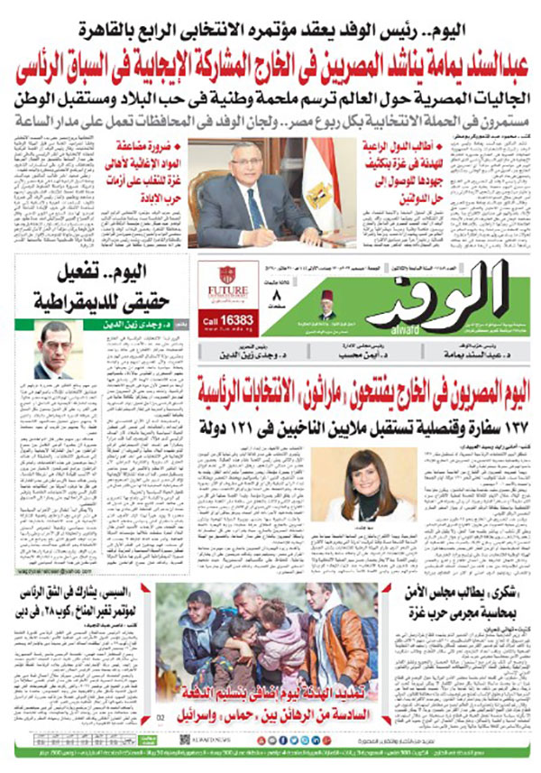 تنشر جريدة الوفد اليومية الورقية في عددها الصادر، غدًا الجمعة، العديد من الموضوعات والتقارير الإخبارية المهمة، أبرزها: "اليوم.. رئيس الوفد يعقد مؤتمره الانتخابي الرابع بالقاهرة".