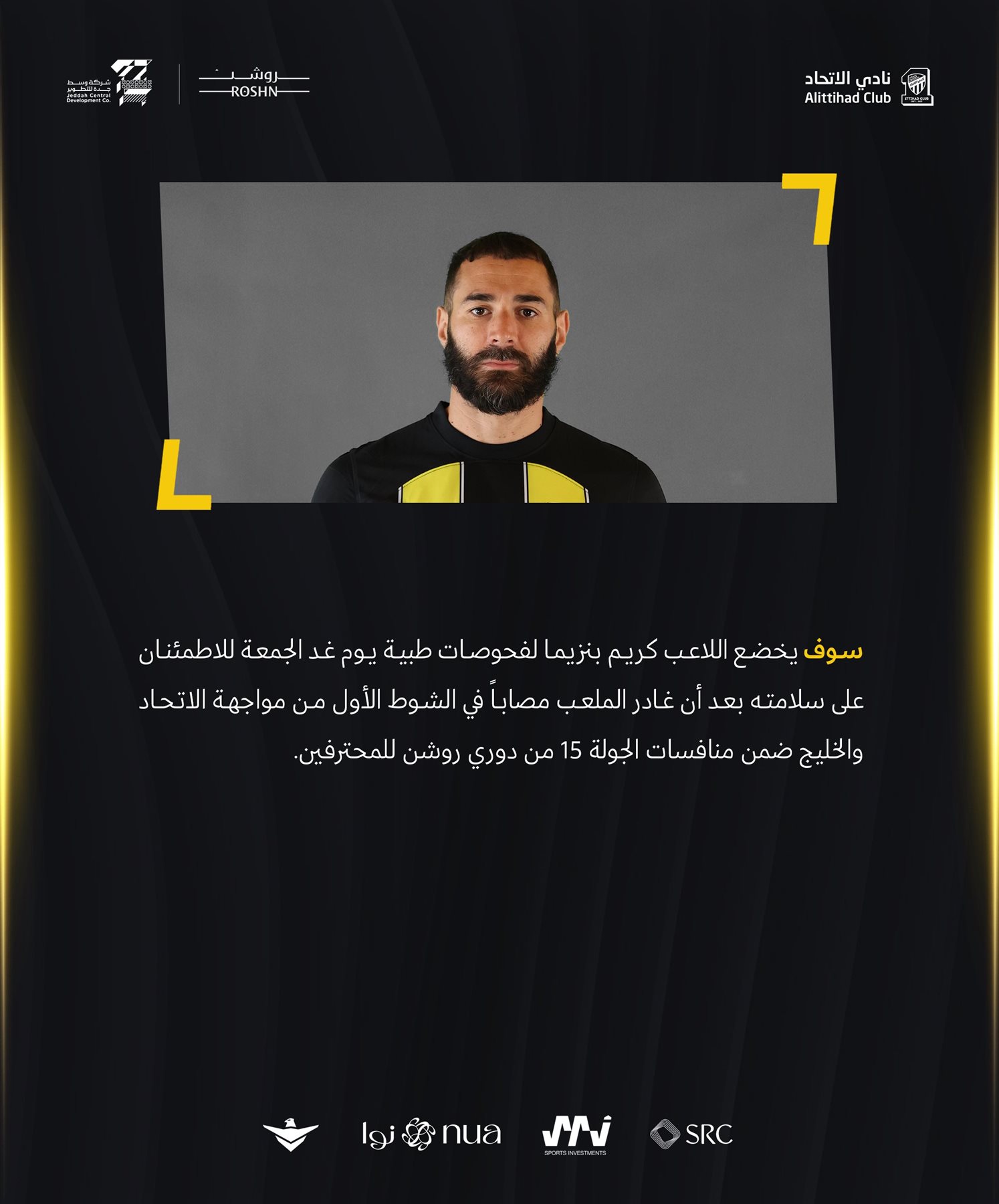 ونشر نادي الاتحاد بيان رسميا أكد فيه خضوع النجم مريم بنزيما لفخصوات طبية غدا الجمعة بعدما غادر ملعب مباراة الاتحاد والخليج مصابا.