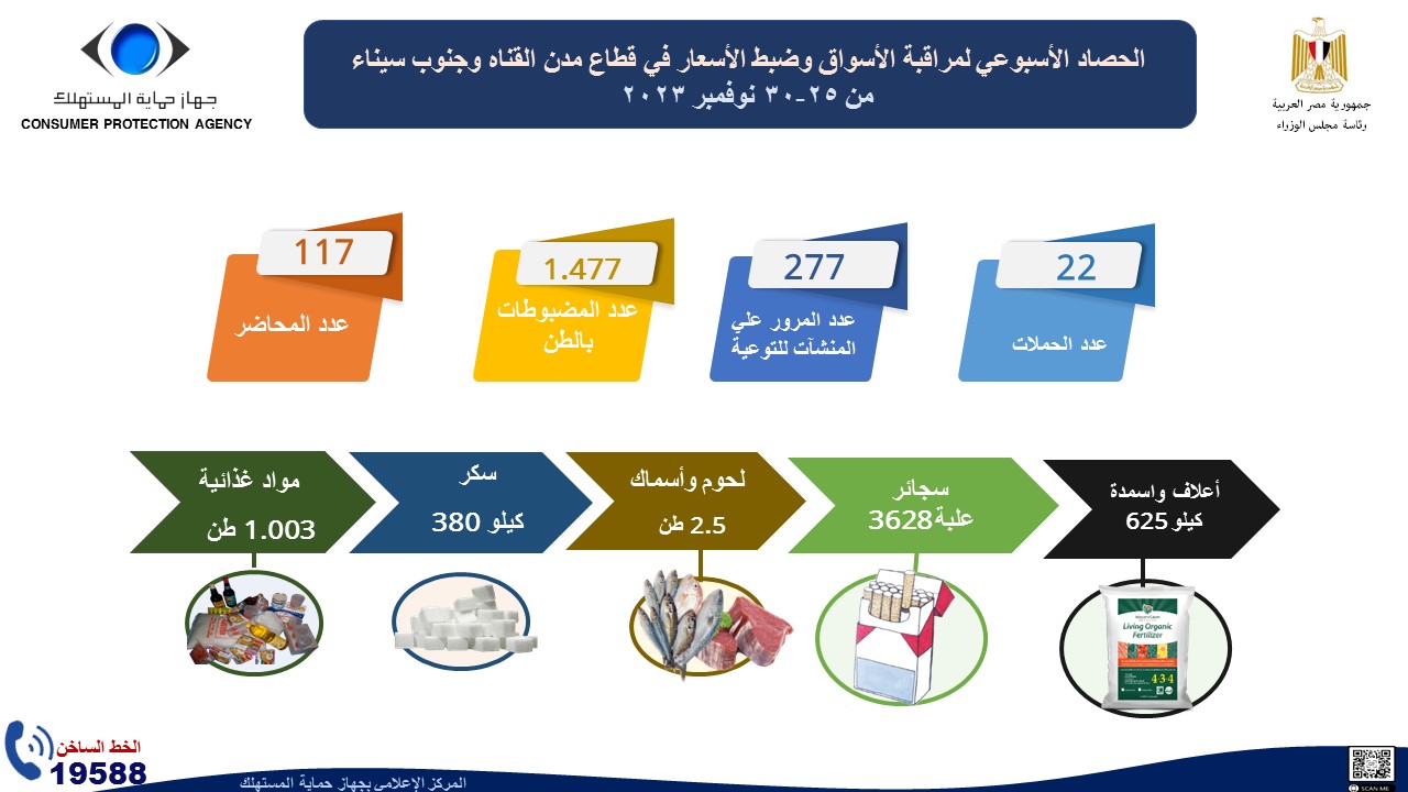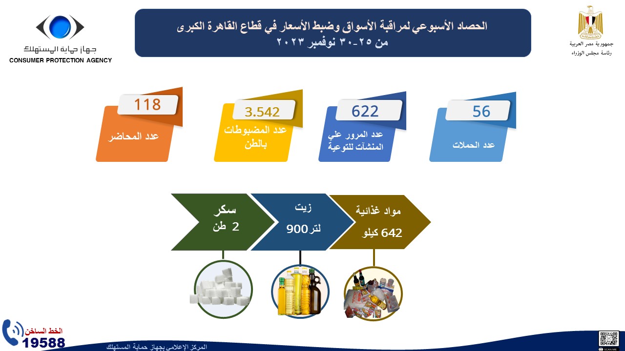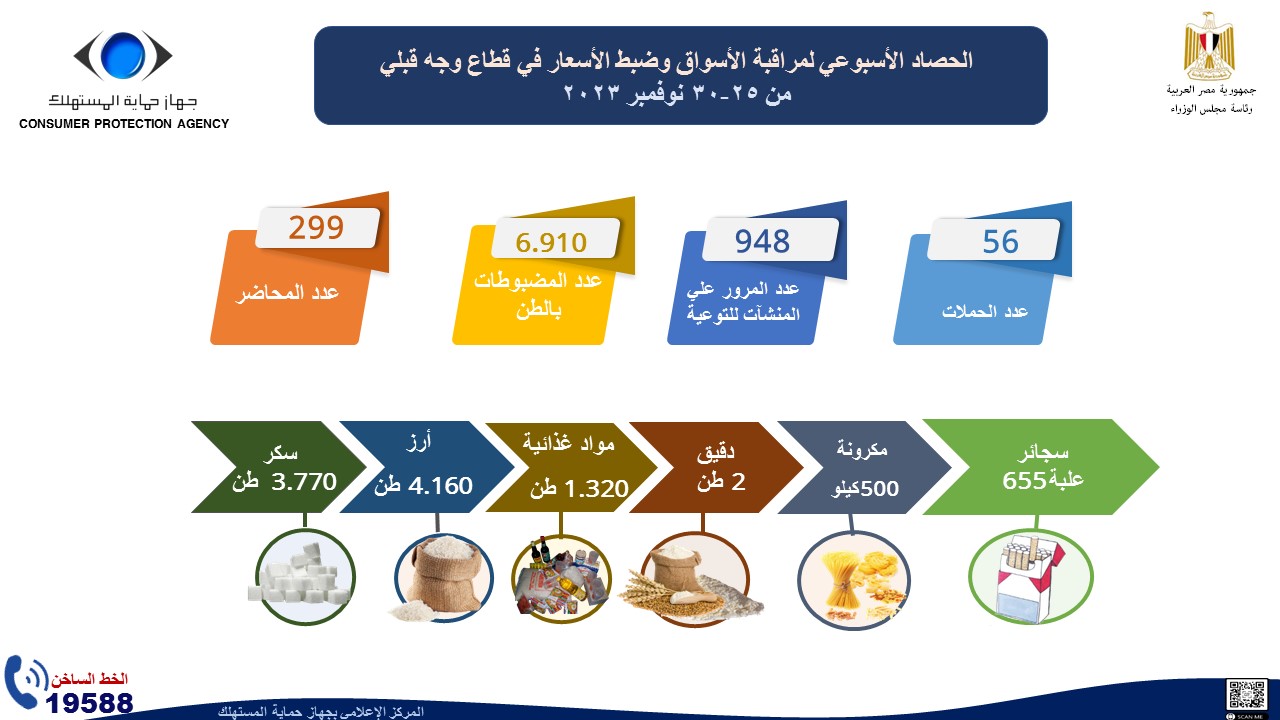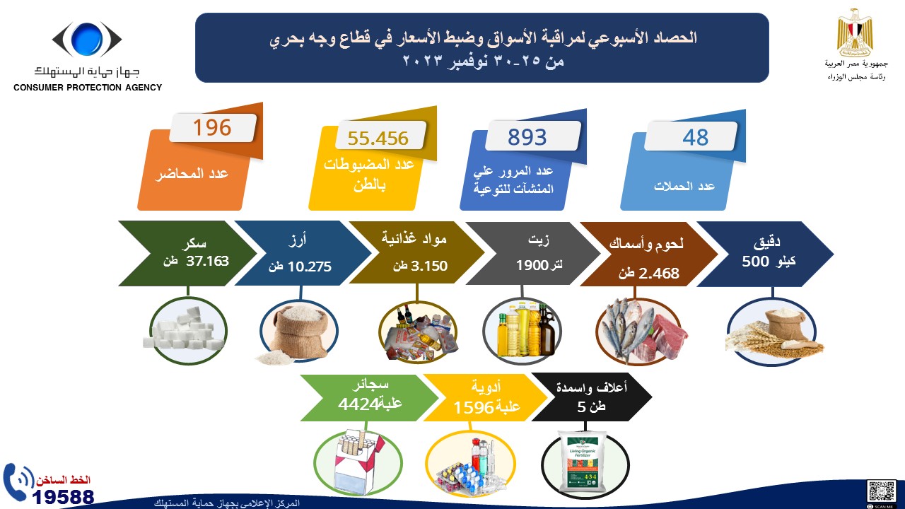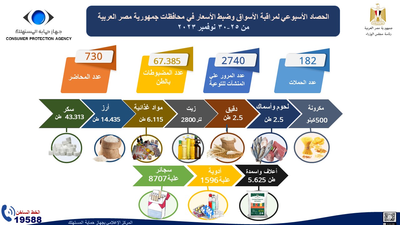 أصدر المركز الإعلامي لجهاز حماية المستهلك "الإنفوجراف الأسبوعي " حول حصاد أهم الأنشطة والشكاوي والبلاغات الواردة لمركز استقبال وفحص البلاغات والشكاوي والحملات الرقابية التي قام بها الجهاز خلال الأسبوع الماضي في الفترة من 25 وحتي 30 نوفمبر الماضي، إذ نستعرض أبرزها في التقرير الآتي والذي نشرته الصفحة الرسمية للجهاز على موقع التواصل الاجتماعي "فيس بوك "، وجاءت كالآتي: