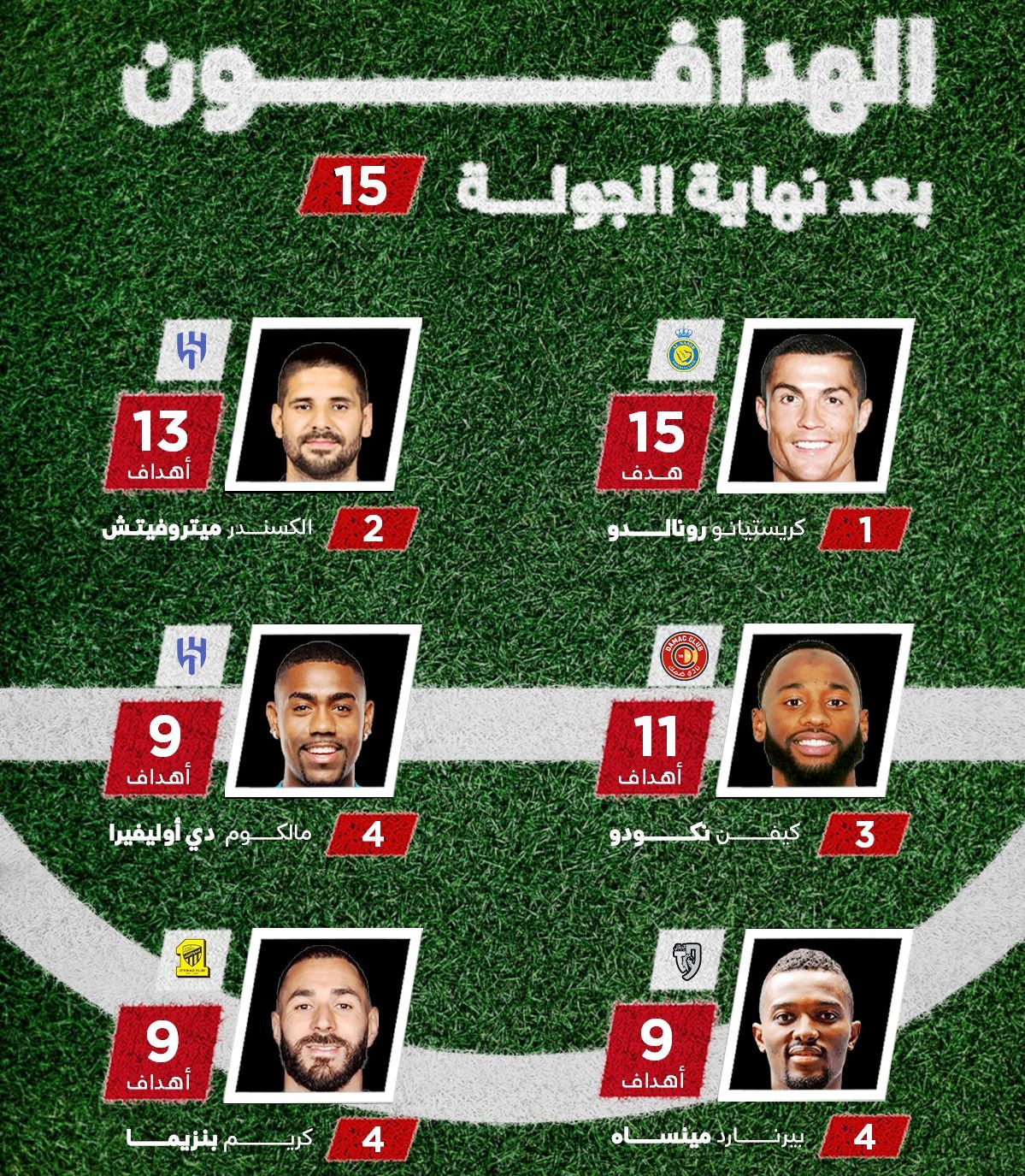 ترصد لكم بوابة الوفد ترتيب هدافي الدوري السعودي بعد مرور 15 جولة، حيث يشهد الصراع على اللقب منافسة شرسة بين النجم البرتغالي كريستيانو رونالدو والنجم الصربي ميتروفيتش.