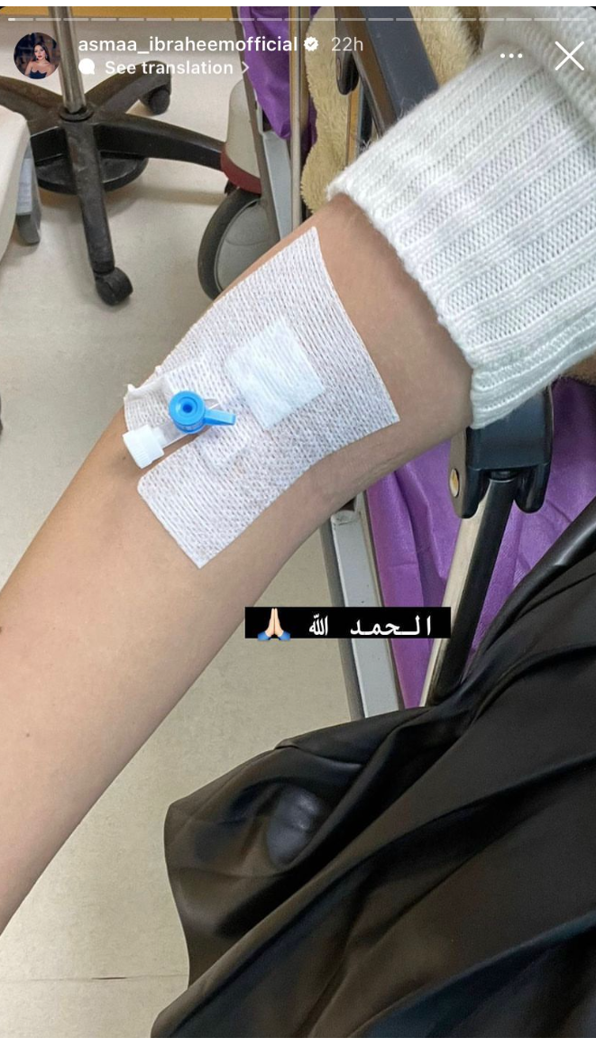 ونشرت أسما إبراهيم، عبر خاصية “ستوري”، صورة لـ ذراعها وعلقت به “كالونا” لتتلقى العلاج من خلالها، وعلقت عليها قائلة : “الحمد لله”.