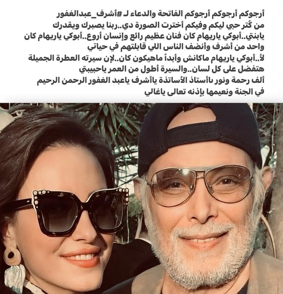 وأضاف “عبدالله”:" ربنا يصبرك ويقدرك يابنتي، أبوكي يا ريهام كان فنان عظيم ورائع، وانسان اروع، أبوكي كان واحد من أشرف وأنضف الناس اللي قابلتهم في حياتي ".