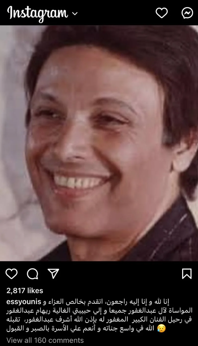 حرصت الفنانة إسعاد يونس، على نعي الراحل الفنان أشرف عبد الغفور، وذلك عبر حسابها الرسمي على موقع تبادل الصور والفيديوهات الشهير إنستجرام.