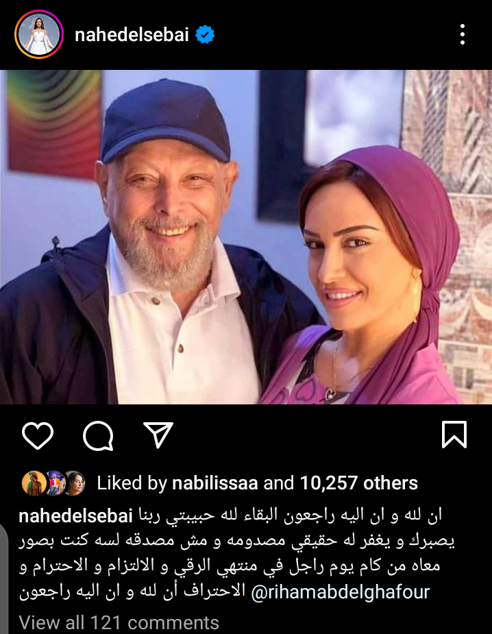 نعت الفنانة ناهد السباعي، الفنان القدير أشرف عبد الغفور الذي رحل عن عالمنا مساء أمس في حادث سير، وذلك عبر حسابه الرسمي على موقع تبادل الصور الفيديوهات الشهير انستجرام.