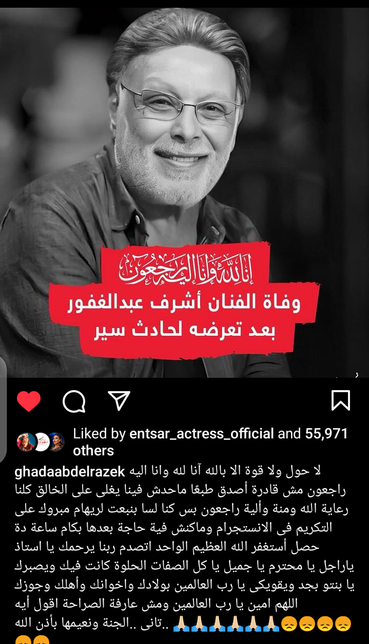نعت الفنانة غادة عبد الرازق، الفنان أشرف عبد الغفور الذي رحل عن عالمنا مساء أمس، وذلك عبر حسابها الرسمي على موقع تبادل الصور والفيديوهات الشهير "انستجرام".