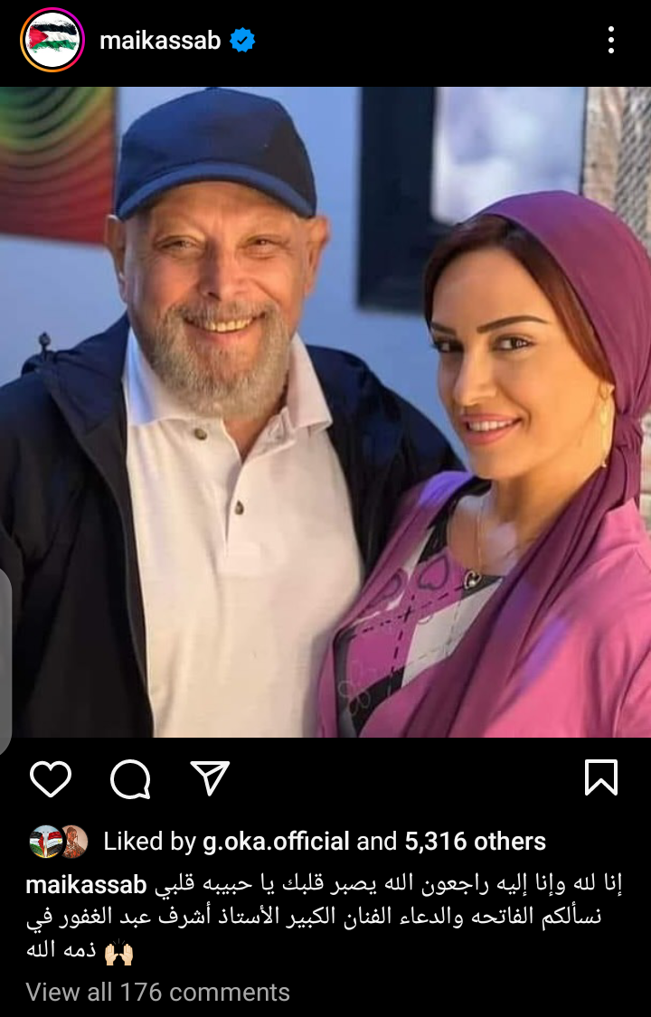 وكتبت "مي"، عبر حسابها قائلة : "إنا لله وإنا إليه راجعون.. الله يصبر قلبك يا حبيبة قلبي، نسألكم الفاتحة والدعاء الفنان الكبير الأستاذ أشرف عبد الغفور في ذمة الله".