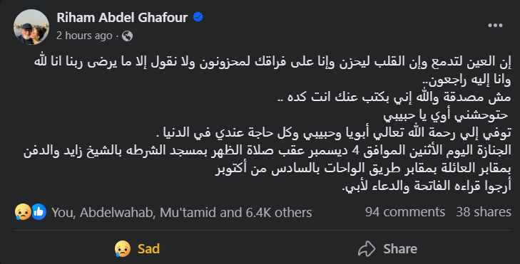 كما كشفت ريهام عبد الغفور عن موعد جنازة والدها الراحل قائلة: "الجنازة اليوم الاثنين الموافق 4 ديسمبر عقب صلاة الظهر بمسجد الشرطة بالشيخ زايد".