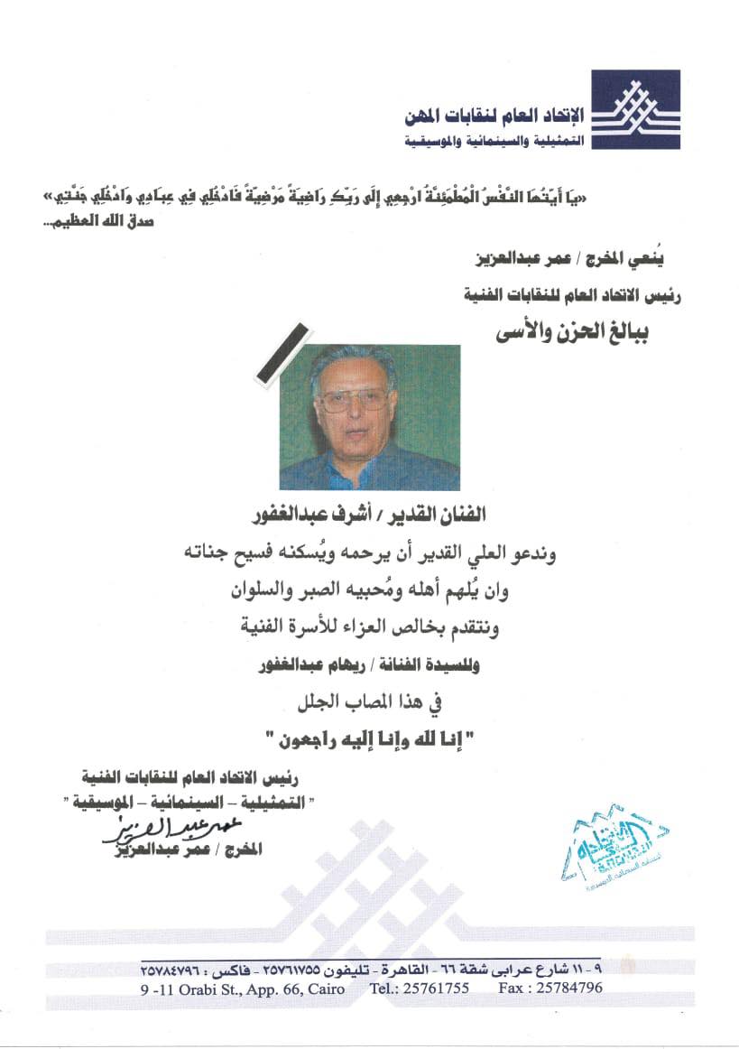 وأصدر اتحاد النقابات الفنية بيانًا رسميًا نعى خلال الراحل أشرف عبدالغفور، وقال البيان:" ينعي المخرج عمر عبدالعزيز ببالغ الحزن والأسى الفنان القدير أشرف عبدالغفور، وندعو العلي القدير أن يرحمه ويُسكنه فسيح جناته، وأن يلهم أهله ومُحبيه الصبر والسلوان ".