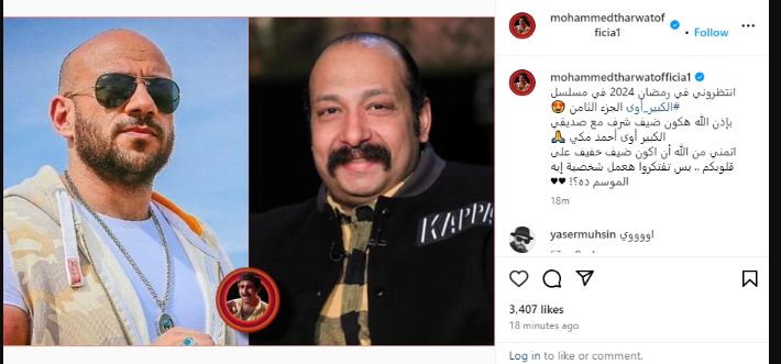 نشر محمد ثروت، منشورًا عبر حسابه الشخصي بموقع تبادل الصور والفيديوهات إنستجرام، قائلاً: "انتظروني في رمضان 2024 في مسلسل الكبير أوي الجزء الثامن.. بإذن الله هكون ضيف شرف مع صديقي الكبير أوي أحمد مكي.. أتمني من الله أن أكون ضيف خفيف على قلوبكم.. بس تفتكروا هعمل شخصية إيه الموسم ده".