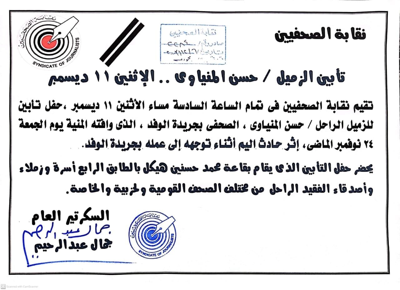 تُقيم نقابة الصحفيين فى تمام الساعة السادسة مساء الاثنين 11 ديسمبر، حفل تأبين للزميل الراحل حسن المنياوى، الصحفى بجريدة الوفد، الذى وافته المنية يوم الجمعة 24 نوفمبر الماضى، إثر حادث أليم أثناء توجهه إلى عمله بجريدة الوفد.