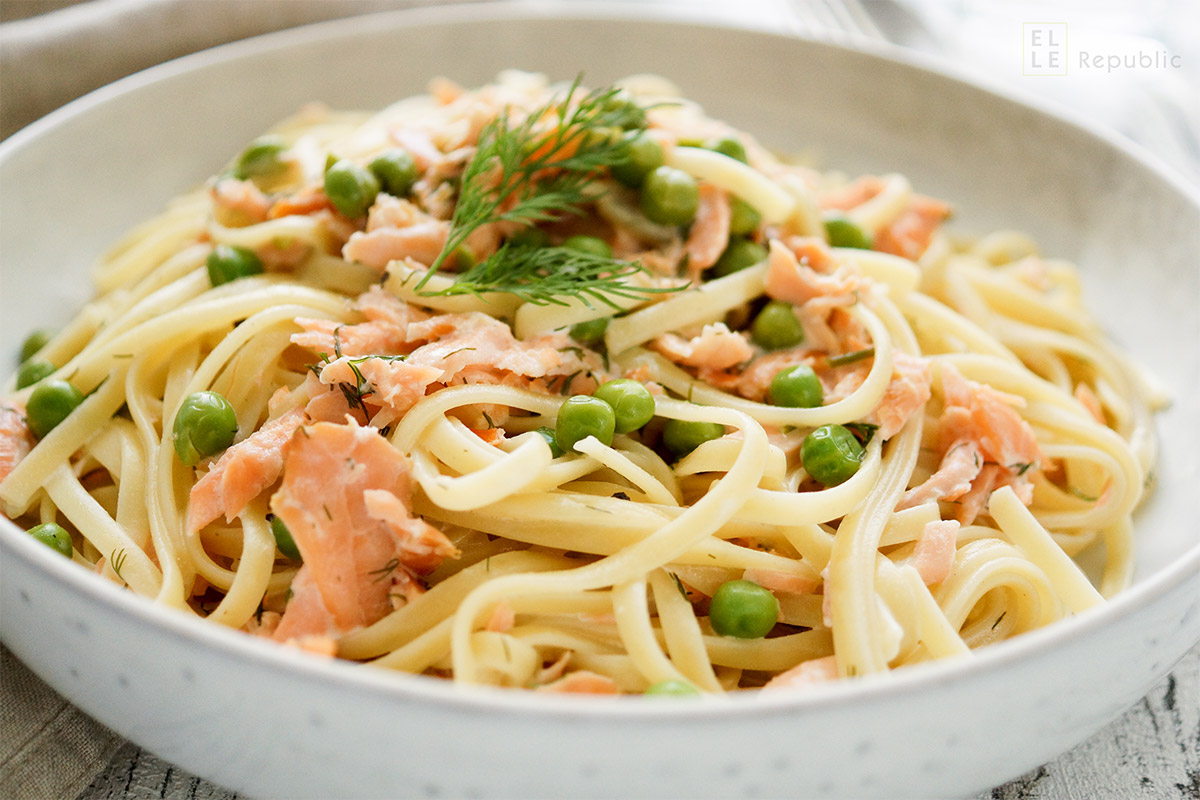 تملّح المكرونة، وتقدّم مزينّة بقطع فيليه السلمون، وفرم البقدونس.