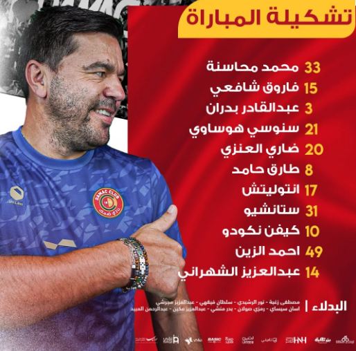 ويتواجد على مقاعد البدلاء: "مصطفة زغبة، نور الرشيدي، سلطان فيقهي، عبد العزيز مجرشي، اسا سيساي، رمزي صولان، بدر منشي، عبد العزيز مكين، عبد الرحمن العبيد".