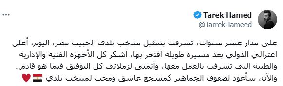ونشر طارق حامد عبر حسابه الرسمي على موقع التواصل الاجتماعي “إكس”: “ على مدار عشر سنوات، تشرفت بتمثيل منتخب بلدي الحبيب مصر، اليوم، أعلن اعتزالي الدولي بعد مسيرة طويلة أفتخر بها”.