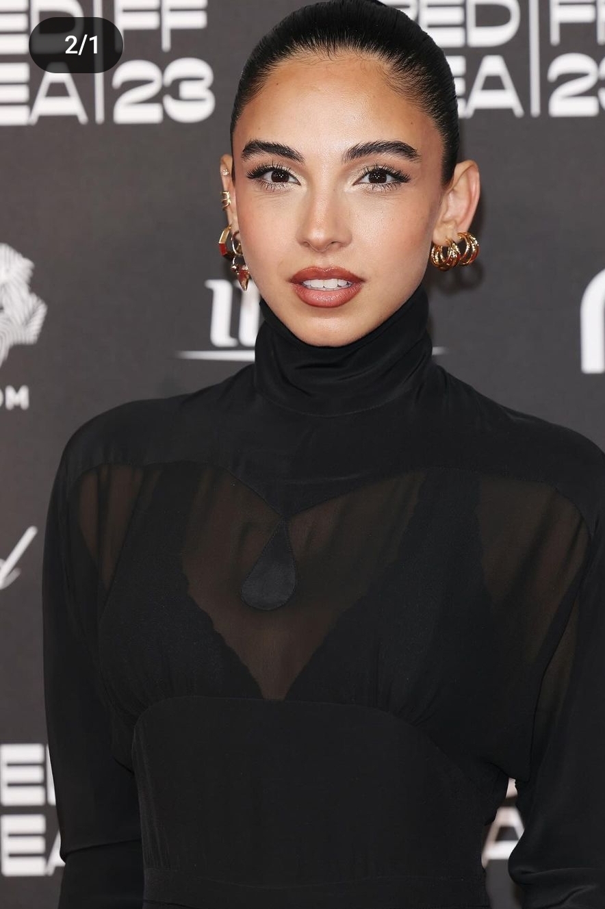 أما من الناحية الجمالية، اعتمدت تسريحة شعر بسيطة للوراء كعكه ووضعت مكياجًا جذابًا مرتكزًا على الألوان الترابية لتتناسب مع لون بشرتها الخمرية مع تحديد عينيها بالكحل والماسكرا السوداء ولون النود في الشفاه.