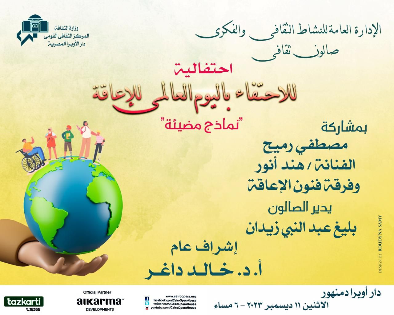 تحتفى دار الأوبرا المصرية، برئاسة الدكتور خالد داغر، باليوم العالمي للأشخاص ذوي الإعاقة من خلال صالون اوبرا دمنهور الثقافي، الذى يعقد لقاء مع مصطفى رميح البطل المصري العالي في رياضة رفع الأثقال، المنشدة هند أنور.
