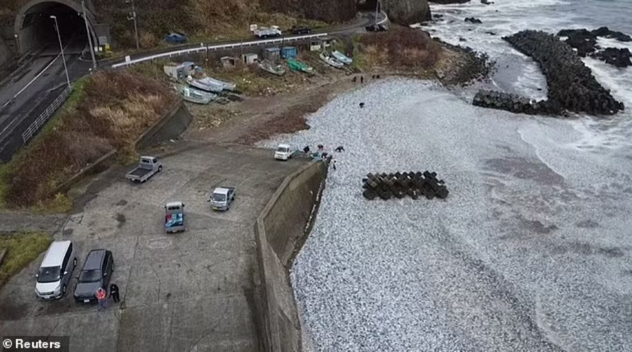 وبحسب صحيفة "ديلي ميل" البريطانية، جرفت الأمواج سمك السردين وسمك الماكريل إلى الشاطئ في هاكوداته بجزيرة هوكايدو الرئيسية في أقصى شمال اليابان صباح يوم الخميس، مما أدى إلى ظهور غطاء فضي مثير للقلق غطى ما يقرب من ميل من الشاطئ.
