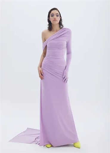 ظهرت أسماء جلال بفستان من الجيرسية باللون الليلا، البنفسجي الفاتح، جاء بتصميم ضيق ومزود بـCape متطاير على ذراع واحد فقط، وكم واحد مزود بقفاز، أما اليد الثانية فجاءت بكم ساقط Off Shoulder، وهو من تصميم مصمم الأزياء السعودي يوسف أكبر، وبلغ سعره إلى 2490 دولار، أي ما يعادل 77 ألف جنيه مصري.