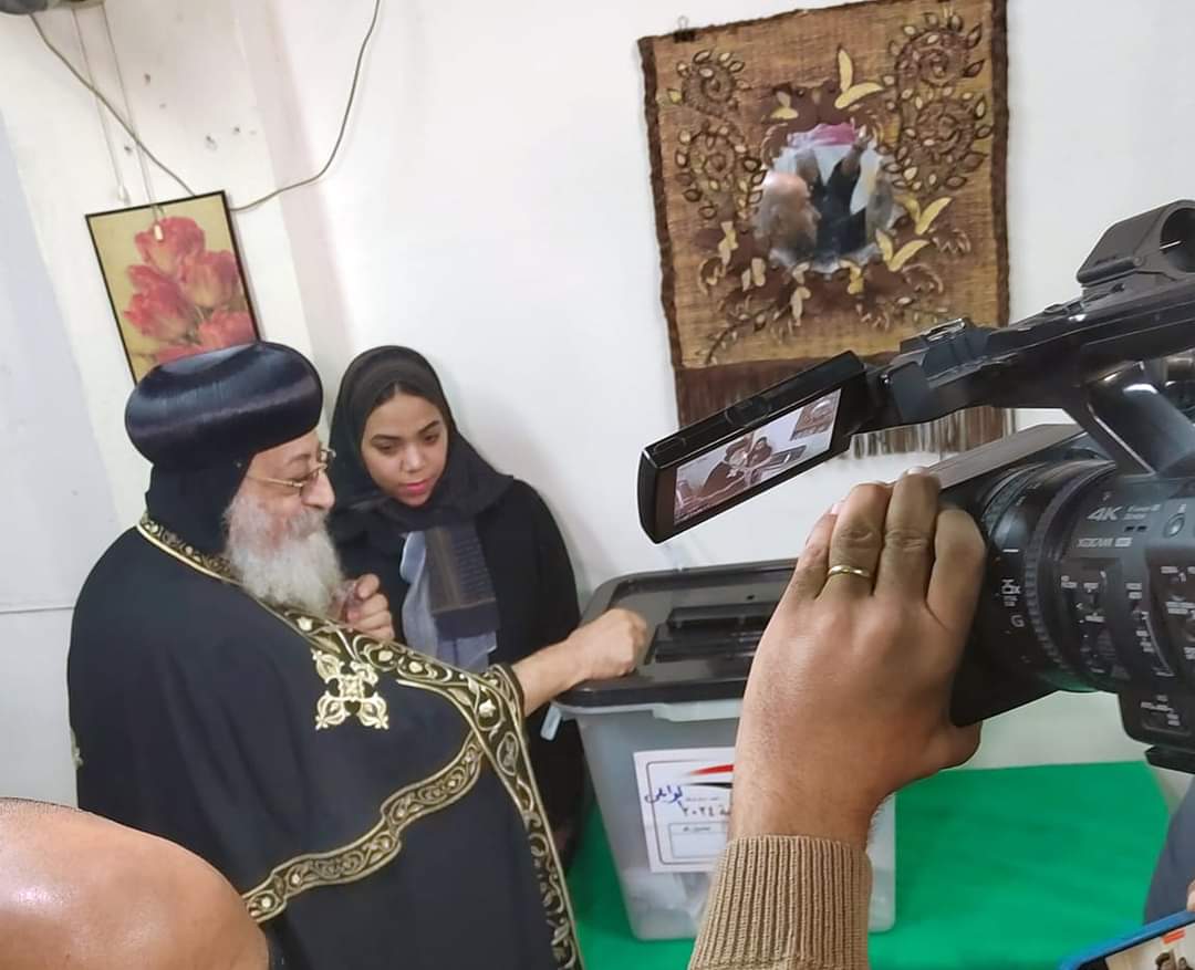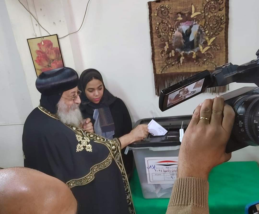 ادلى  قداسة البابا تواضروس ألثاني، بابا الإسكندرية بطريرك الكرازة المرقسية، اليوم الاحد، بصوته في الإنتخابات الرئاسية بإحدى اللجان في مدرسة الشهيد امتياز محمد كامل الثانوية بنات، بحي الوايلى في القاهرة.