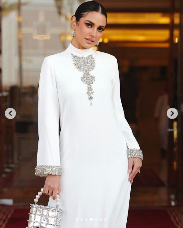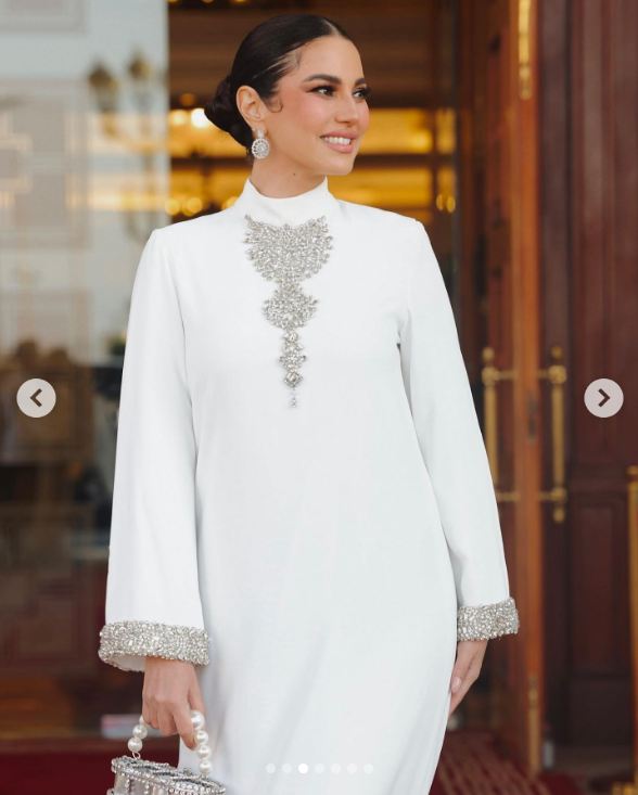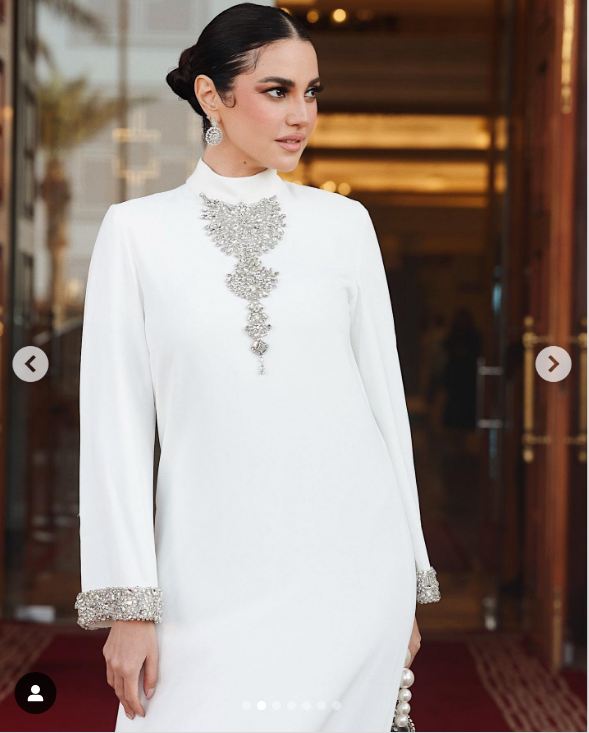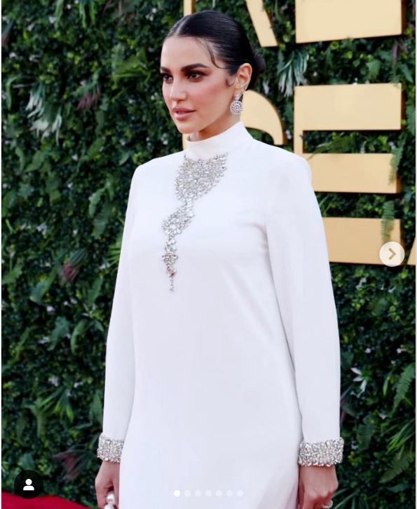 وظهرت الفنانة درة بفستان طويل باللون الأبيض ذا أكمام طويلة ورقبة مرتفعى قليلًا، ومطرز في نهاية الأكمام وحول الرقبة بالكريستال اللامع والسيلفر الميتال.